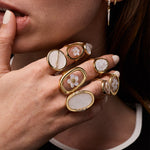 - Bague ronde en plaqué or, zirconiums, résine et fragments de pierres fines