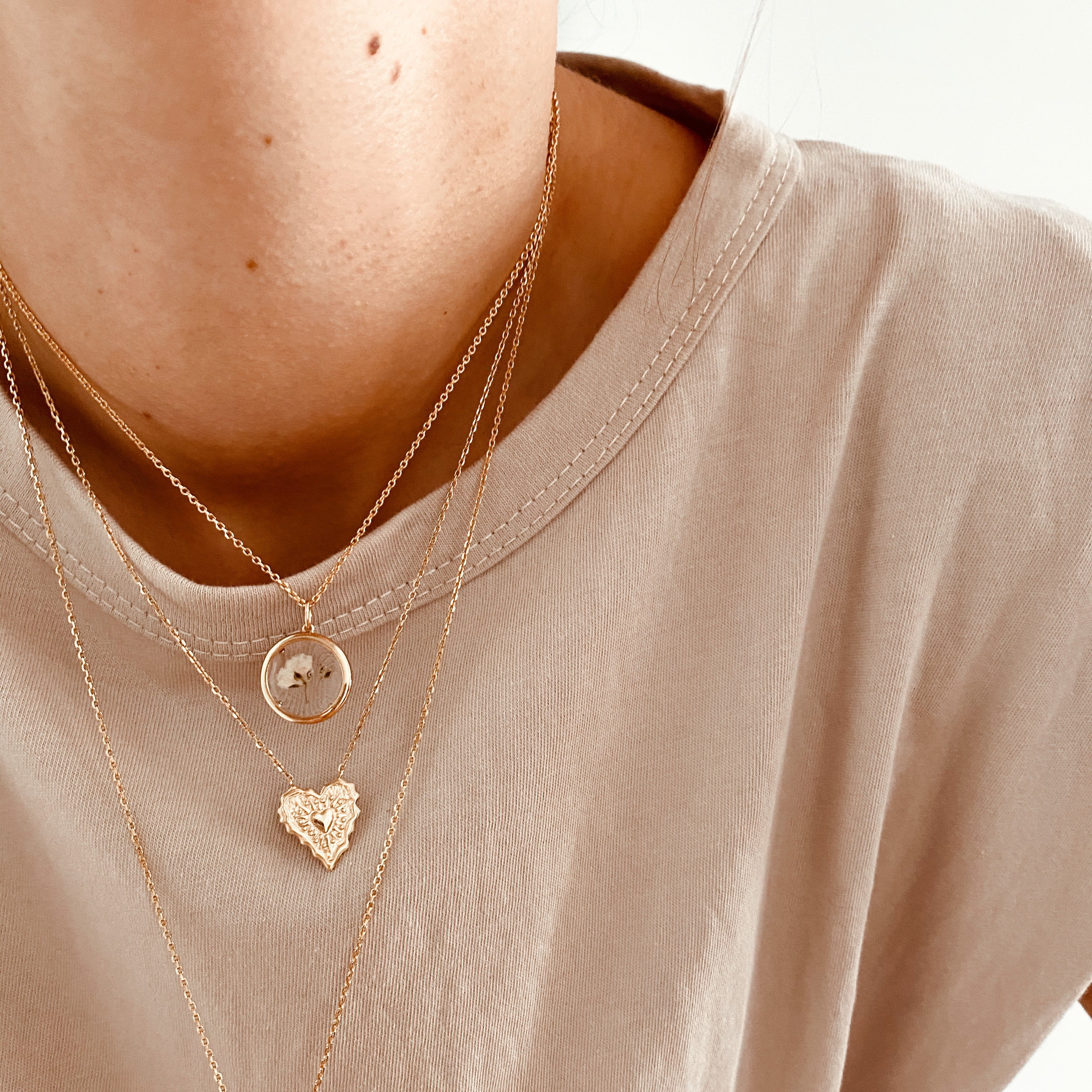 - Collier doré 1 micron, fleurs séchées naturelles et résine