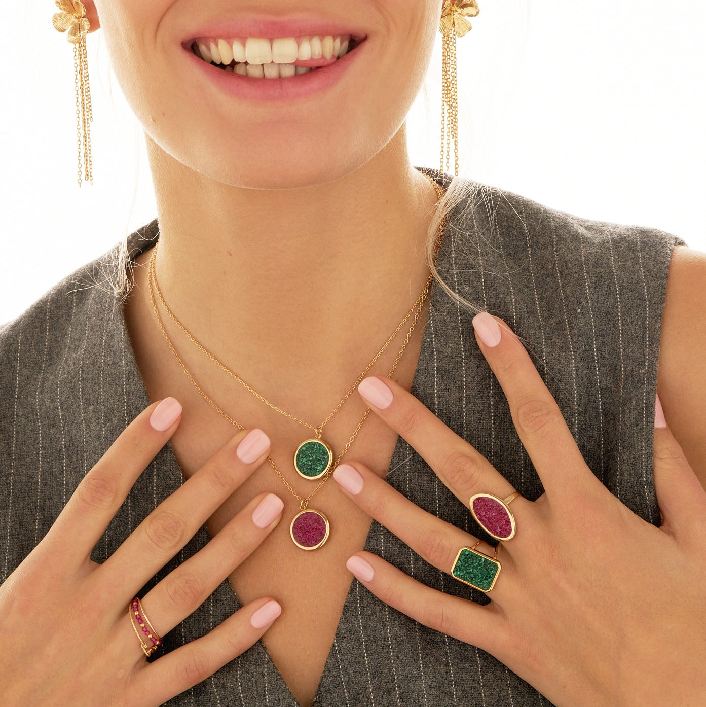 - Collier doré 1 micron, résine et fragments de pierres fines