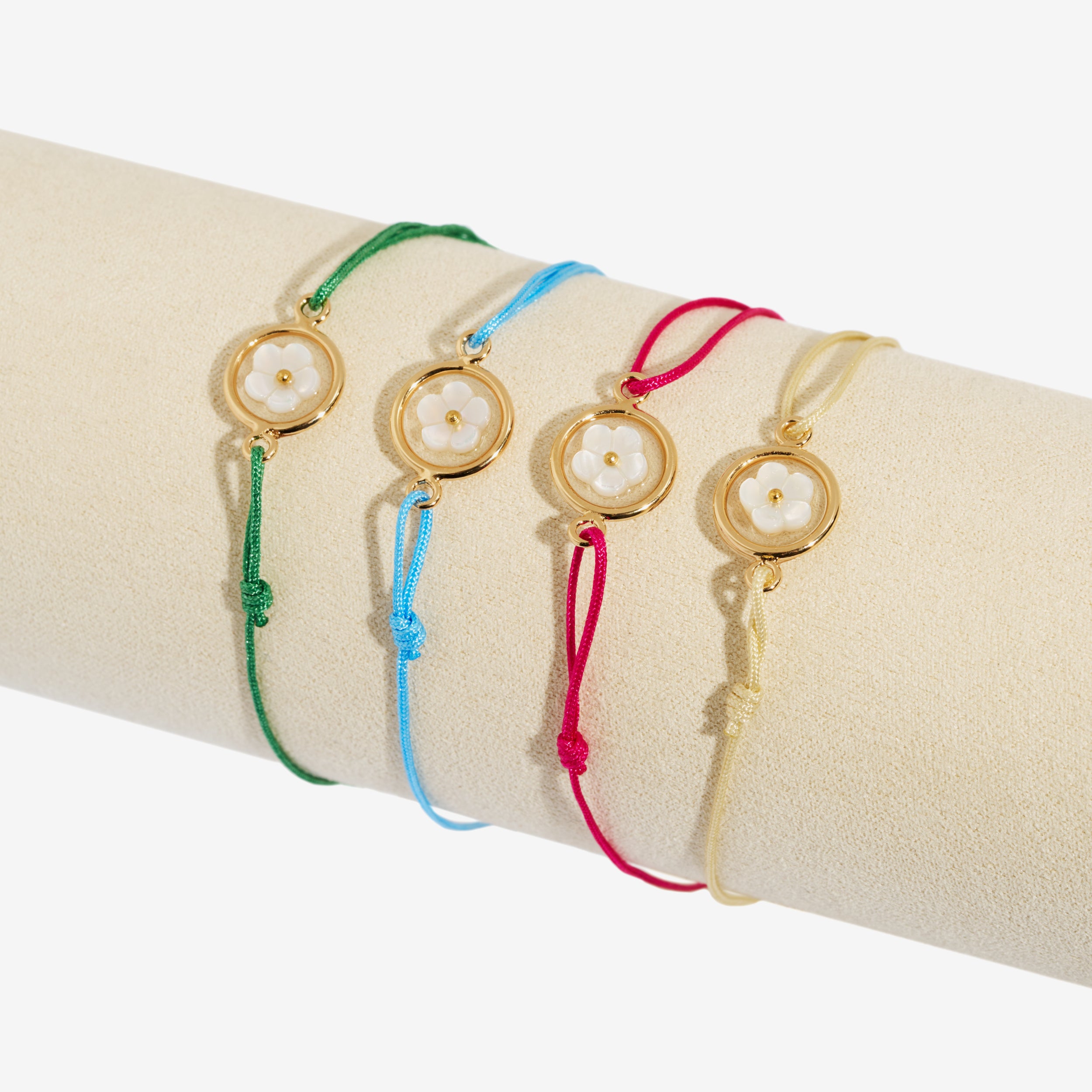 - Bracelet doré 1 micron, nacre et résine sur un cordon en polyester